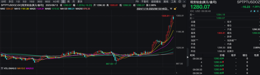 Wind数据显示,6月12日,现货铂金报收1296.3美元/盎司,再创2021年2月以来新高。6月13日现货铂金更一度站上1300美元/盎司,截至发稿,现货铂金跳水报1280.07美元/盎司,跌1.25%。年初至今,现货铂金累计涨幅已超40%。