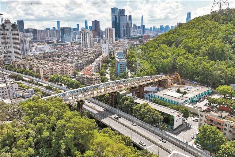 r如今,连接红岗公园和银湖山郊野公园的鲲鹏径二号桥也于9月底合龙,廊桥项目预计年内整体向市民开放,届时将实现银湖山至红岗公园东西马岭的贯通,为城市再添一条流动的生态绿脉。